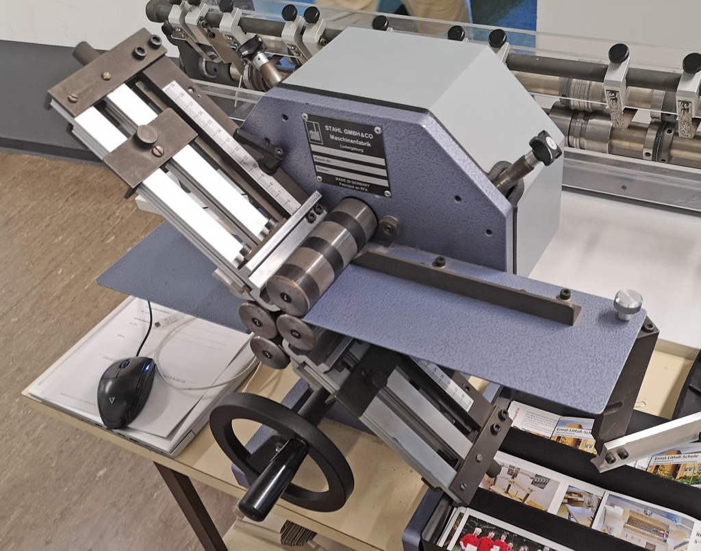 In einigen Schulen steht ein Modell einer Taschenfalz-Maschine von Stahl. Dafür findet ihr hier Vorlagen für drei Jobs zum Umrüsten und Selber-Gestalten.